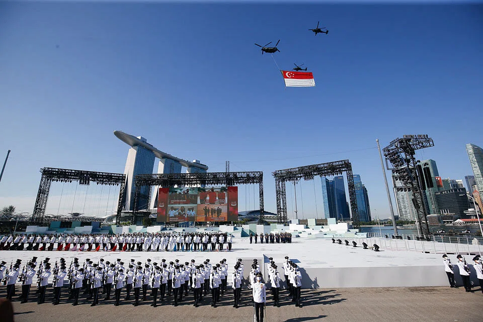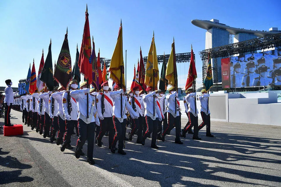 Singapore marked its 56th year since independence with a scaled-down ceremonial parade at The Float @ Marina Bay on Monday morning. Held amid the Covid-19 pandemic, the parade comprising 600 uniformed participants saw strict safety and crowd control measures. Participants were masked and a 1m distance was kept between those in the same contingent.