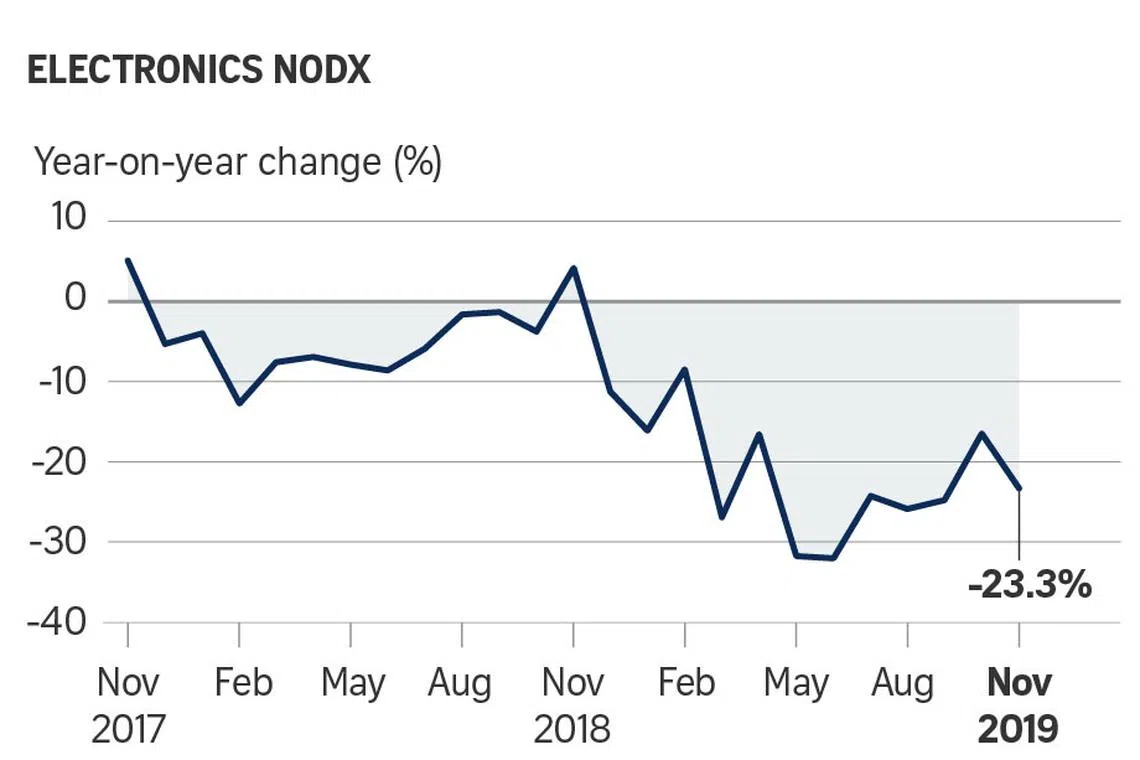 Electronic exports contracted by 23.3 per cent in November, following the 16.4 per cent decline in the previous month. Enterprise Singapore said integrated circuits, personal computers and disk drives contributed the most to the decline, falling by 36.5 per cent, 25.1 per cent and 35.7 per cent respectively.