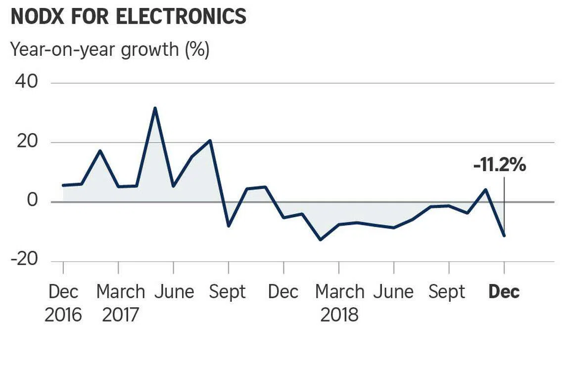 NODX was down 8.5 per cent year on year in December from a high base a year ago, after a 2.8 per cent decline in November, in the first consecutive fall since February and March, 2018. The contraction came on the back of declines in both electronics and non-electronics exports.