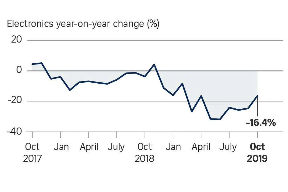 Month on month, the fall eased from a seasonally adjusted 3.3 per cent decrease in September to 2.9 per cent last month. Non-oil re-exports also fell less sharply at 2.3 per cent year on year, following a 2.9 per cent decline in September.