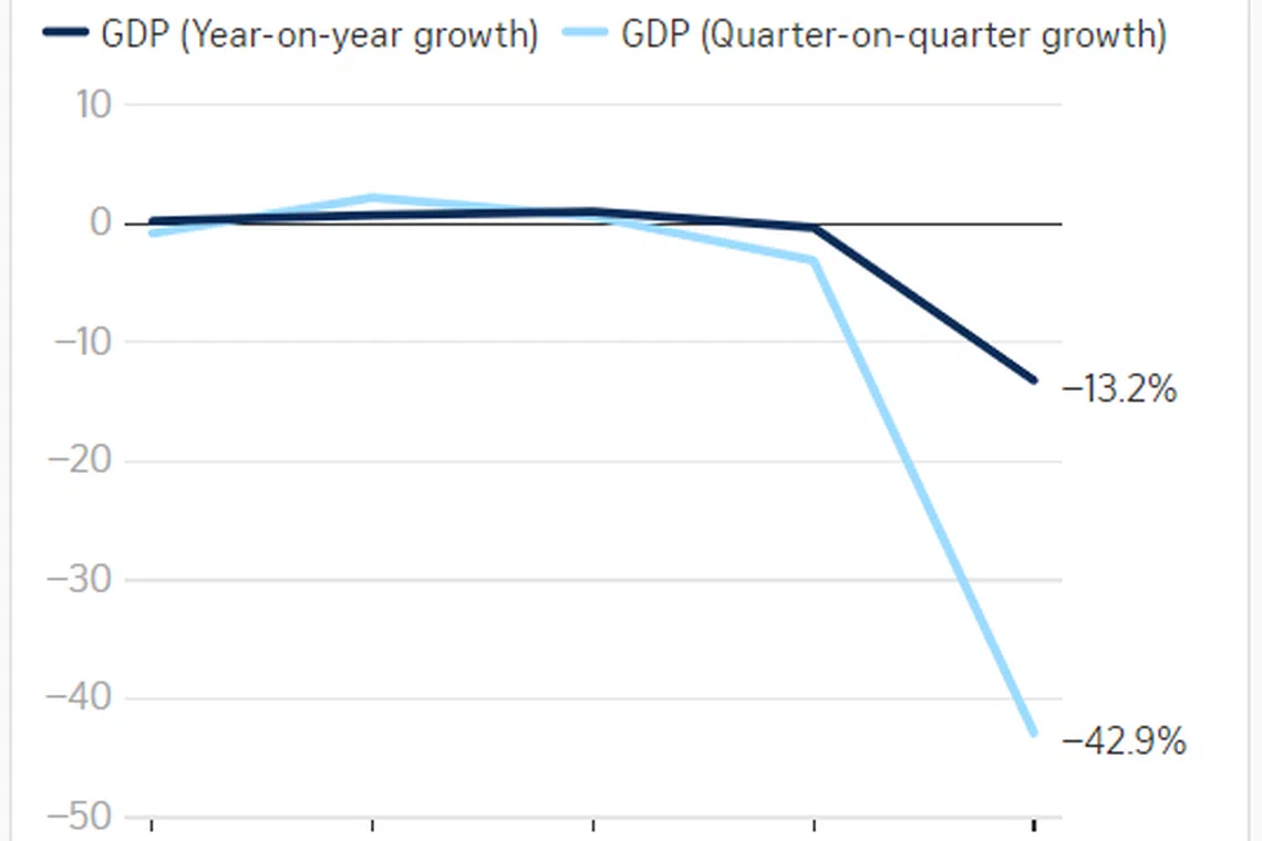 On a seasonally adjusted, quarterly basis, the economy lost 13.1 per cent, against a decline of 0.8 per cent in the first quarter.