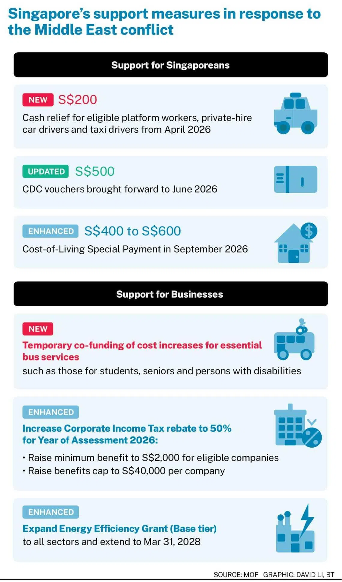 As for households, Siow said Singapore will also bring forward the next tranche of S$500 in CDC Vouchers to June this year, from the original target of January 2027, and increase payouts under the Cost-of-Living Special Payment to ease cost pressures amid uncertainty from the Iran war.