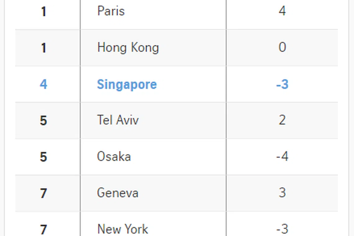 The EIU said "Singapore and Osaka, which have been dislodged from their joint-first with Hong Kong, find themselves at fourth and fifth ranks, respectively, with Osaka tying with Tel Aviv.