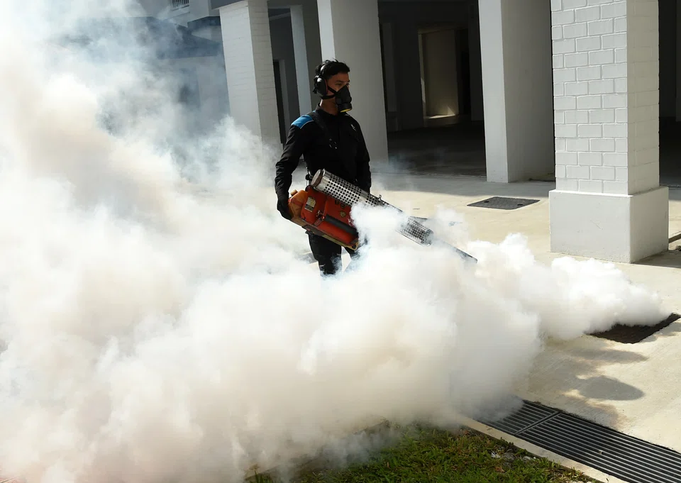 Workers wearing fumigation masks moved methodically through high-rise public housing estates, inspecting plant pots and spraying insecticide via thermal fogging machines.