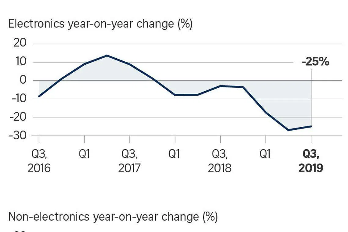 Enterprise Singapore's Q3 figures show that NODX sank 9.6 per cent, easing from the 14.7 per cent plunge in Q2. Total trade declined 6.7 per cent in Q3, after a 2.2 per cent drop in Q2.
