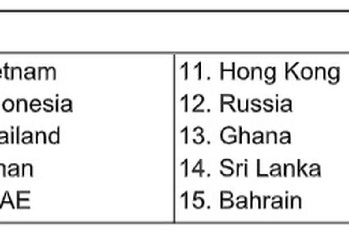 Topping the list was Côte d'Ivoire, followed by India, Kenya and China. Meanwhile, Hong Kong took 11th place, above Sri Lanka at 14th and Singapore at 16th.