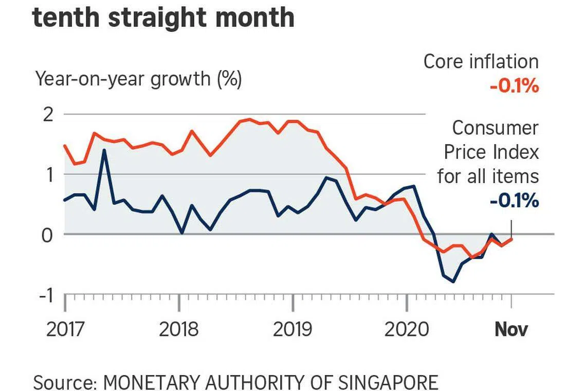 With the latest figures, core CPI has fallen 0.1 per cent year on year in the first 11 months, noted Barclays economist Brian Tan, who kept his full-year forecast of -0.1 per cent.