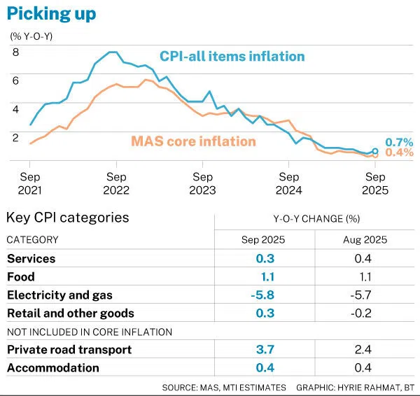 Singapore’s core inflation inches up to 0.4% in September, above forecasts