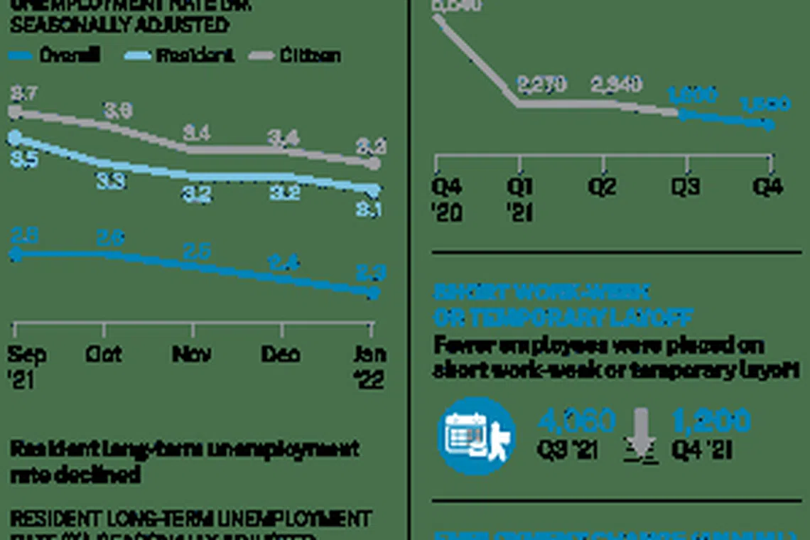 As business activities picked up, fewer employees were also placed on short work-week arrangements or temporarily laid off by Q4, though the number remains above pre-pandemic levels, said MOM.