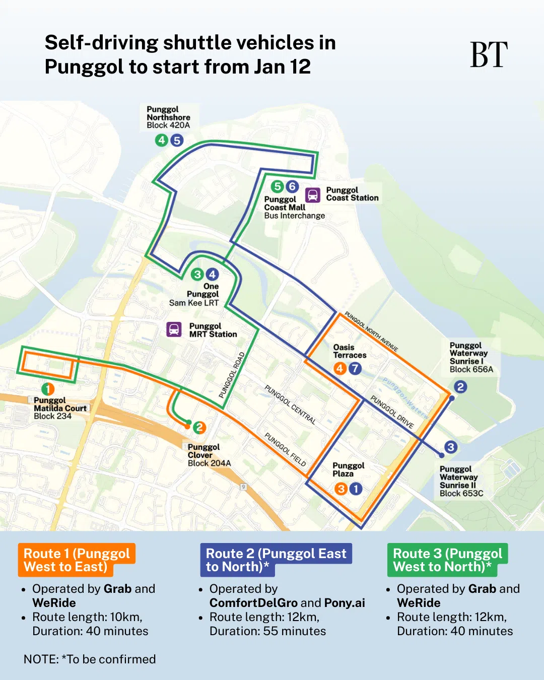 Grab, in partnership with Guangzhou-headquartered WeRide, will operate two of three shuttle routes in Punggol. Singapore-headquartered multi-modal transport operator ComfortDelGro will operate the third route in Punggol in partnership with Pony.ai, which is dual-headquartered in Guangzhou and Fremont, California.