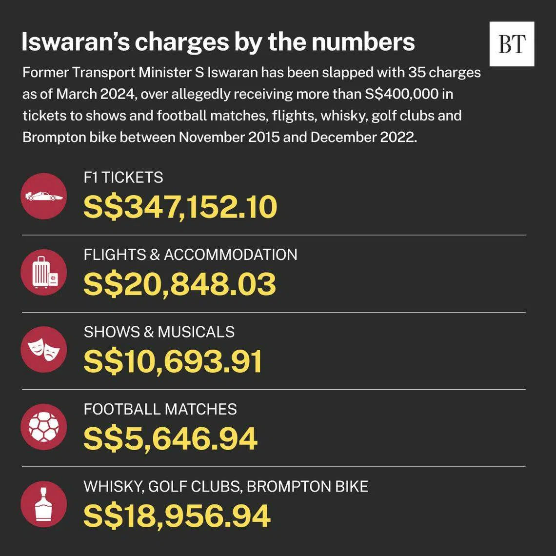 S ISWARAN was charged on Monday (Mar 25) with eight counts of obtaining 10 bottles of whisky, 12 bottles of wine and some golf clubs worth S$18,956.94 in total from listed Lum Chang Holdings’ managing director when he was the transport minister.
