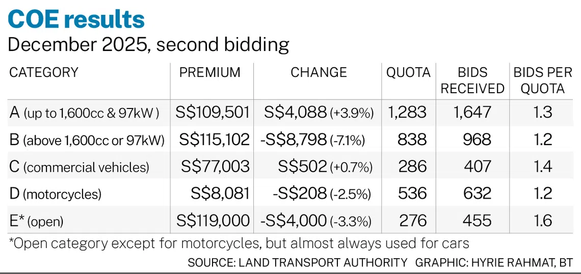 In December’s first round of bidding, the category’s premium dropped to S$105,413, its lowest level since August. It had climbed to a new record of S$128,105 in October, after an announcement in September that EV incentives would be reduced beginning in 2026.