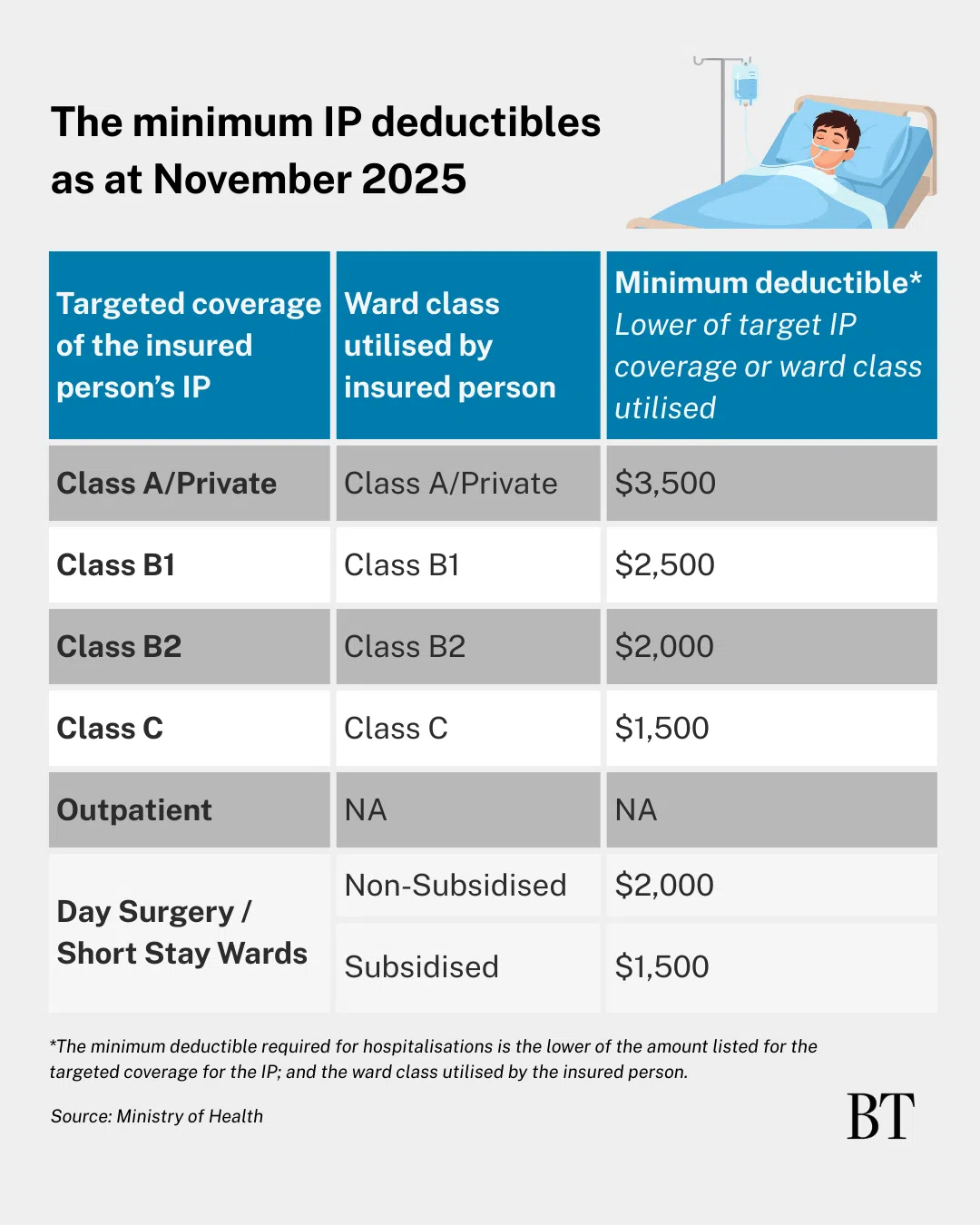 MOH sets the minimum deductible for each ward class; for instance, the deductible for private hospital and Class A wards is S$3,500.
