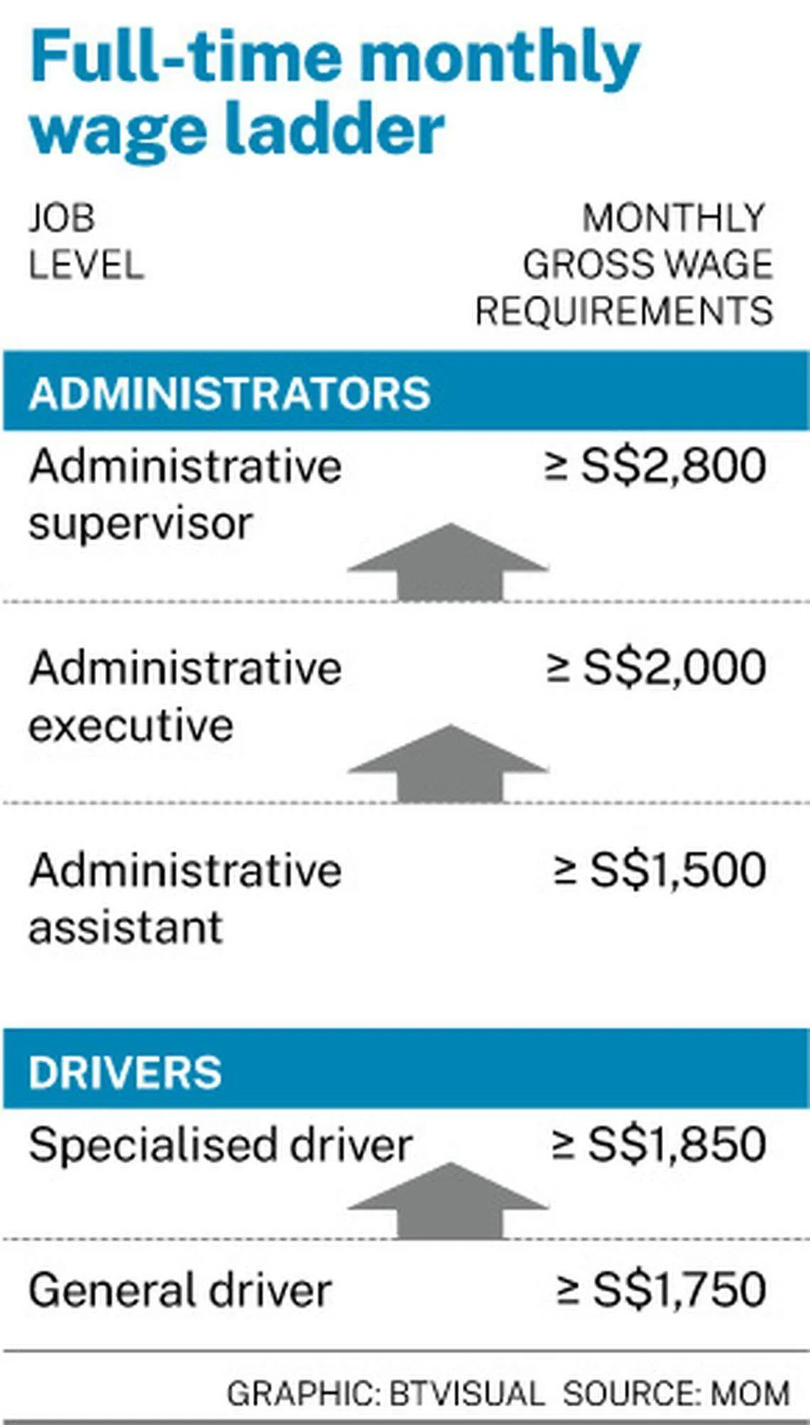 General drivers, who operate vehicles on a Class 3 licence or below, must be paid at least S$1,750 a month. Specialised drivers must be paid at least S$1,850. These include drivers of vehicles requiring a Class 4 licence and above, such as lorries and buses, as well as other specialised roles such as chauffeurs.