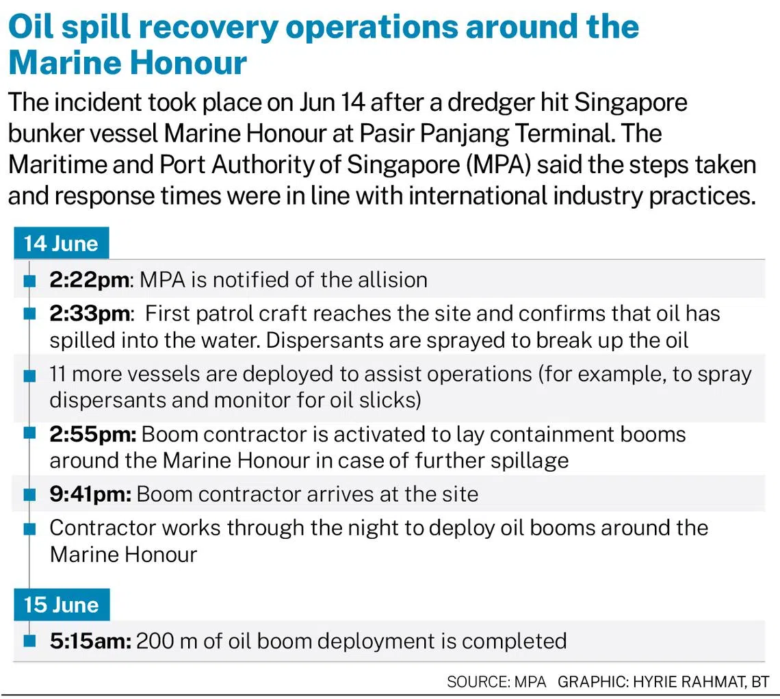 The oil spill in the Strait of Singapore was caused by a Netherlands-flagged dredger Vox Maxima hitting Singapore-flagged bunker vessel Marine Honour in Pasir Panjang Terminal on Jun 14.