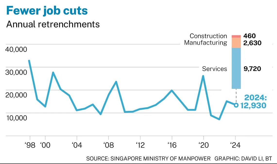 Business reorganisation or restructuring continued to be the primary reason for layoffs in 2024, said MOM, and the number of job cuts recorded remains within non-recession norms. There was also no significant increase in retrenchments across sectors.