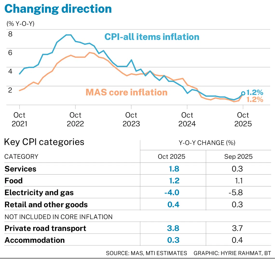 Core inflation, which excludes accommodation and private transport, was 1.2 per cent in October, up from 0.4 per cent in September. This was due to higher inflation in services, food, and retail and other goods, MAS and MTI said.