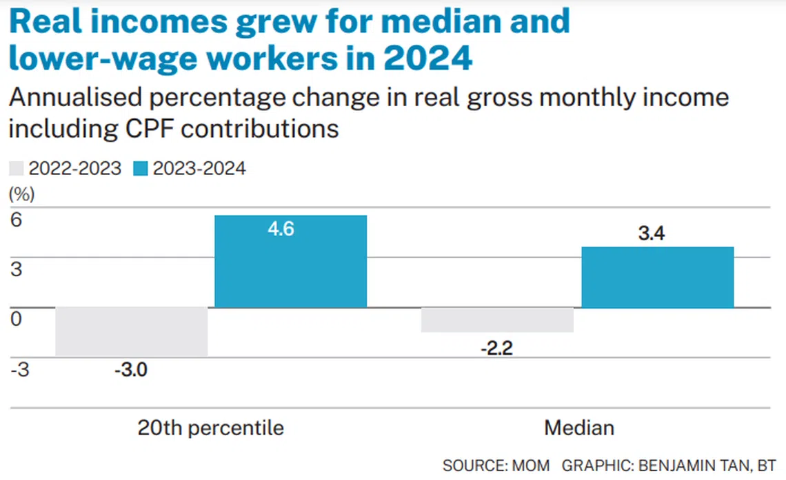 REAL incomes in Singapore made a rebound in 2024 as inflation eased, recovering from the previous year’s decline, the Ministry of Manpower’s (MOM) annual Labour Force in Singapore Advance Release report showed on Thursday (Nov 28).
