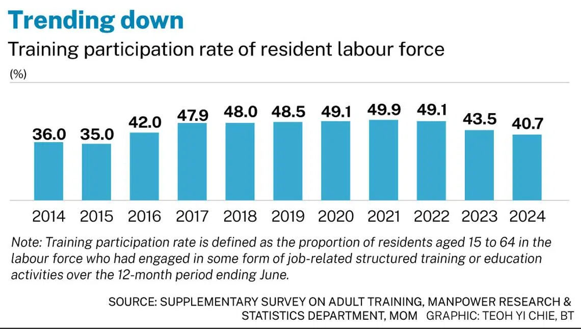 Some 42 per cent of employed residents took part in training, down from 44.6 per cent in 2023. For unemployed residents, participation levels fell 0.4 percentage point to 33.7 per cent.