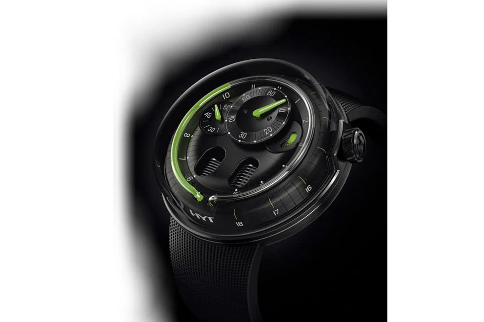 These hydro mechanical horologists employ liquid to tell time on a watch but until now, they have done it only on outsized timepieces. With H0, the folks at HYT - who include scientists and a nuclear engineer - have pared HYT's hydro mechanical watch to its bare essential. The titanium case is downsized to 48 mm - still big but it now looks less ridiculous and is more wearable on the wrist.