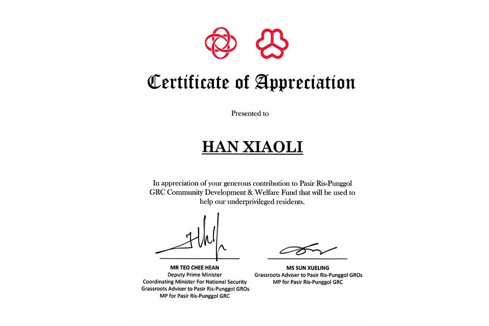 Lobb Heng is also actively engaged in community and social work here. Deputy Prime Minister Teo Chee Hean recently presented a Certificate of Appreciation to Lobb Heng managing director Han Xiaoli for her contribution to Pasir Ris-Punggol GRC Community Development & Welfare Fund. The fund provides assistance to underprivileged residents. DPM also presented a Thank You Certificate to Mr Guan for being a Leading Philanthropist for the Singapore Children's Society.