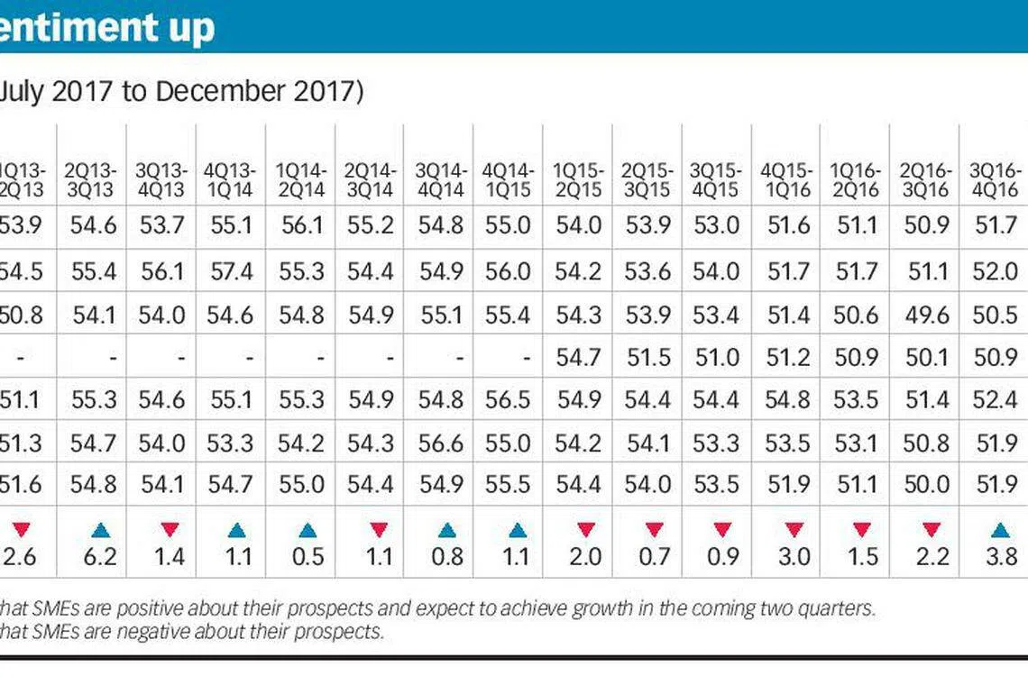 A reading above 50 indicates that SMEs expect growth in the coming two quarters, while a reading below 50 indicates pessimism. The latest survey measures the business outlook for Q3-Q4 2017 from a poll of more than 3,600 SMEs in April and May.