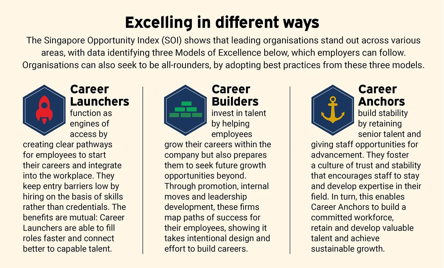The index identifies three Models of Excellence – Career Launchers, Career Builders and Career Anchors (see box below) – showing the different ways in which organisations can shine.