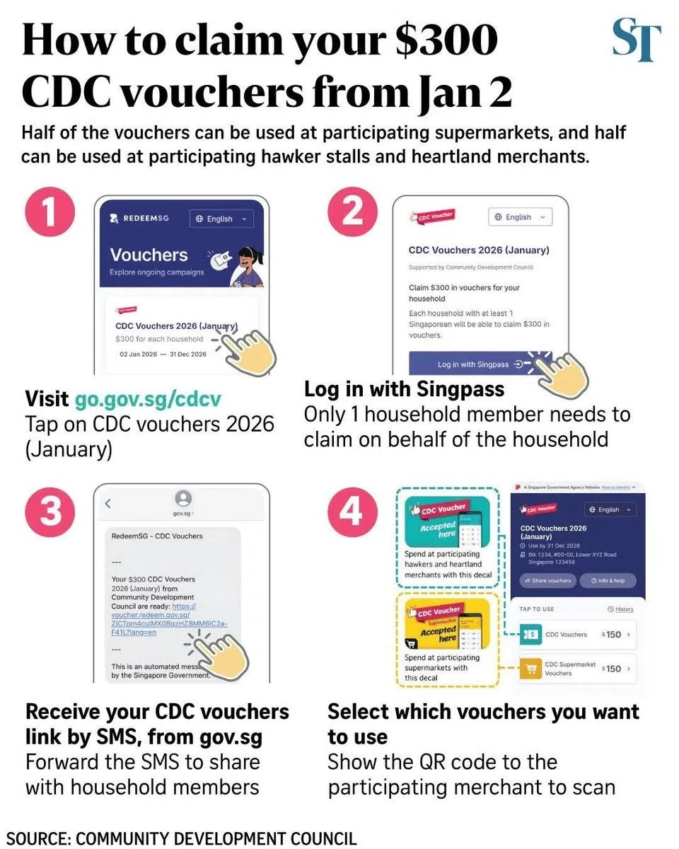 Every Singaporean household can claim S$300 worth of CDC vouchers from Jan 2. This is split equally for use at participating supermarkets, and at participating hawker stalls and heartland merchants. The vouchers, valid till Dec 31, can be claimed online at go.gov.sg/cdcv