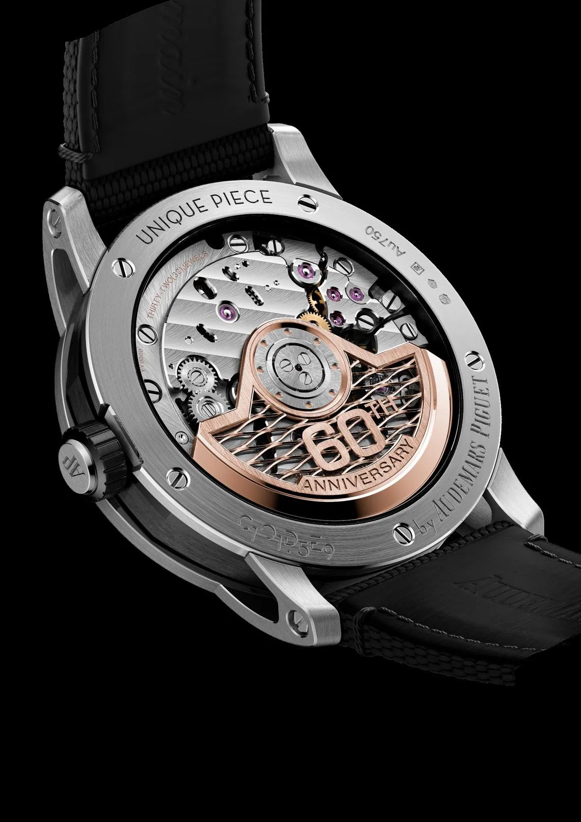 Flip the watch over, and the open sapphire caseback reveals the meticulously finished movement, anchored by a 22-carat pink gold rotor specially openworked with a 60th anniversary motif.