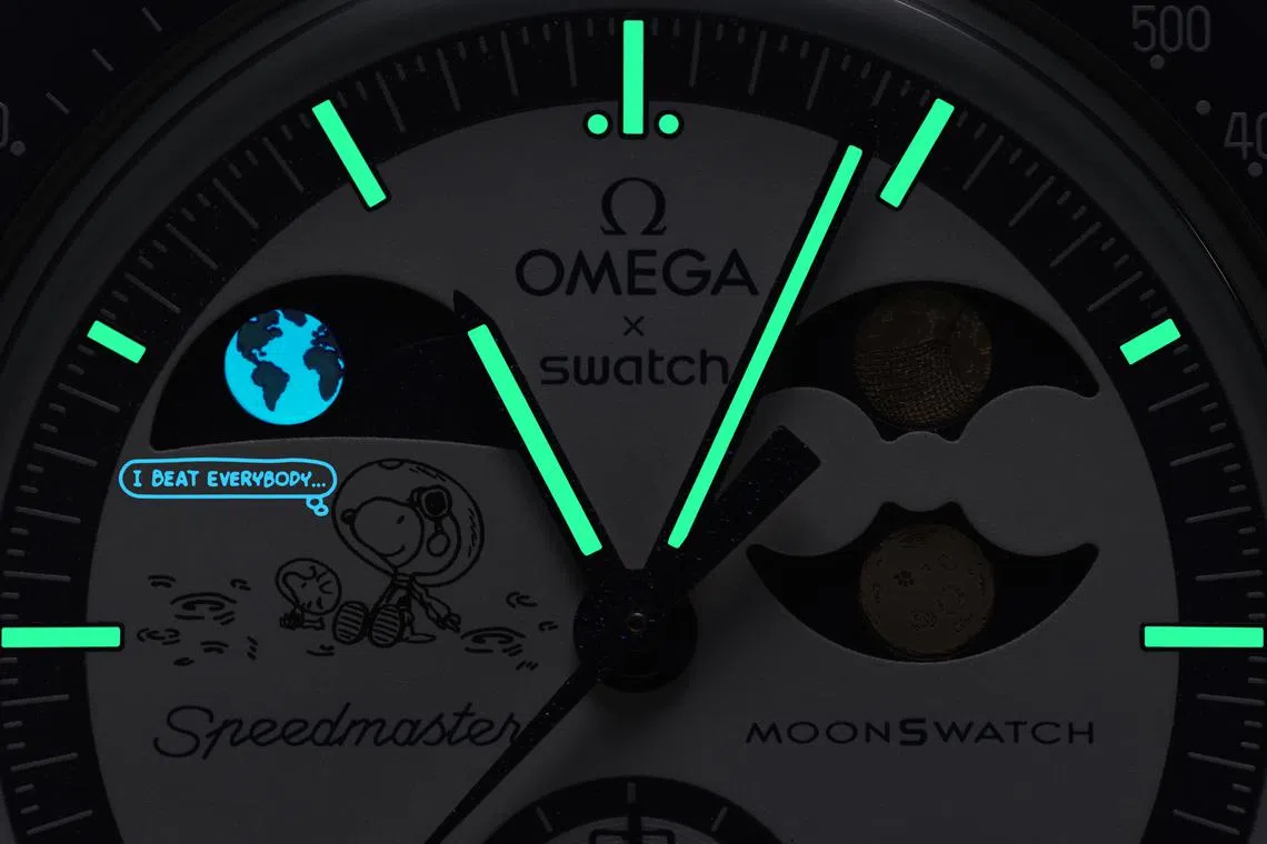 The new MoonSwatch also gets a Peanuts spin, with both Snoopy and Woodstock gracing the dial, and the former’s paw prints adorning one of the full moons. The beagle’s quote “I beat everybody…” appears not just on the case back, but also as a UV-activated Easter egg on the dial – a playful wink at the joy of discovery that has defined the MoonSwatch line.