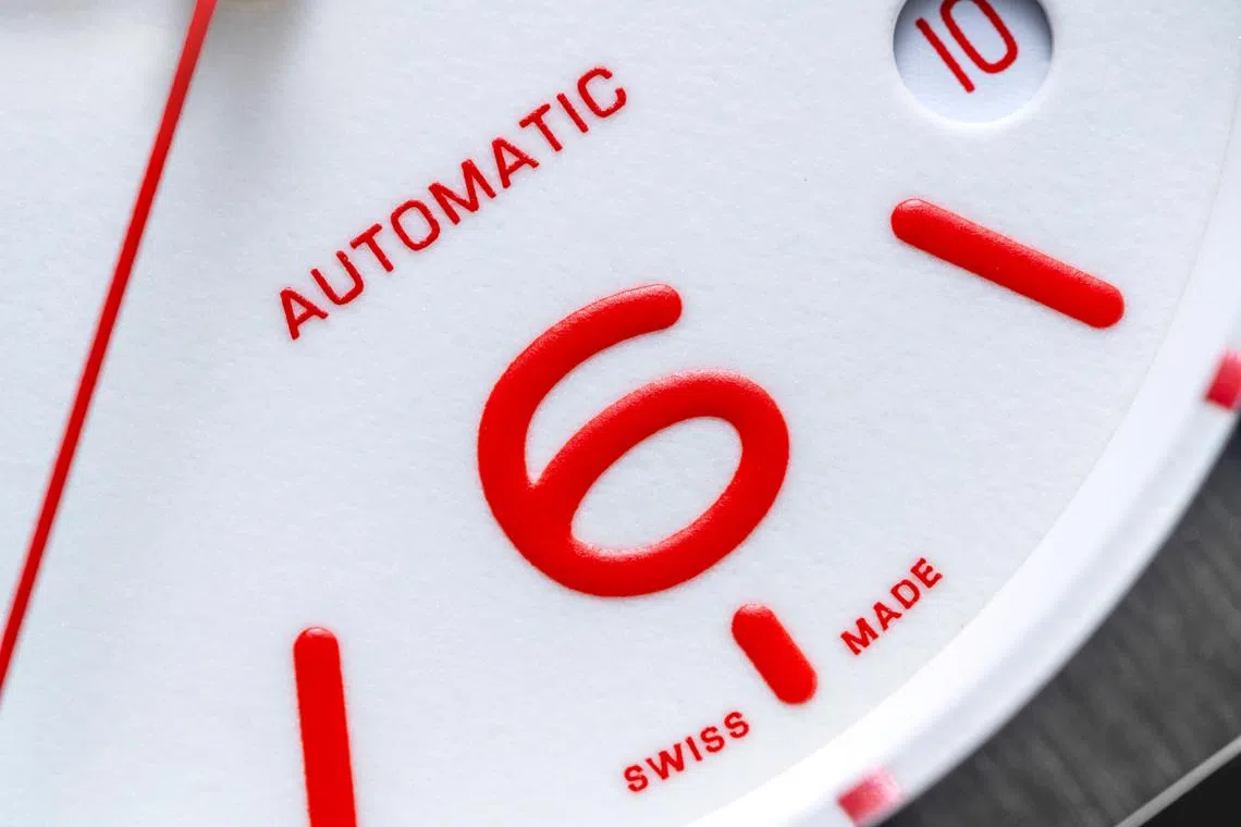 At the heart of the watch lies its most compelling feature – a white Super-LumiNova X2 dial that glows with extraordinary intensity when night falls. Red indexes, including oversized Arabic numerals, echo Bell & Ross’s aviation heritage while also mirroring the colours of Singapore’s national flag.
