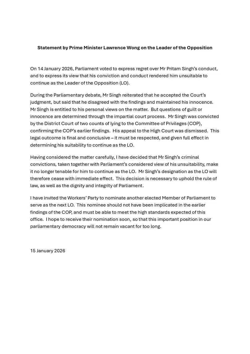 They noted that the WP had already formed a disciplinary panel to look into whether Singh had contravened the party’s Constitution after his convictions were upheld by the High Court in December 2025, and said it expects to complete this process within three months.
