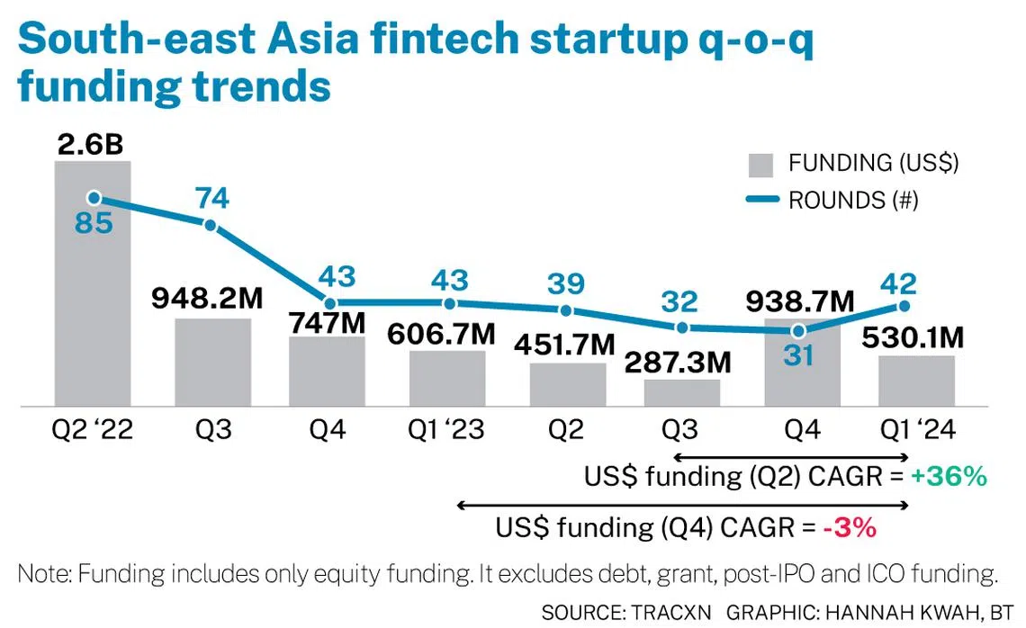 FINANCIAL technology startups in South-east Asia recorded a 13 per cent year-on-year decrease in total funding to US$530 million for the first quarter of 2024, a new report has found.