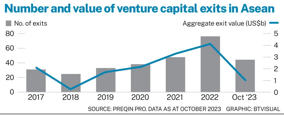 Aggregate exit value had peaked at US$5.8 billion in 2021, when there were 18 exits. Last year, total exit value fell to US$2.6 billion and the number of exits fell to 15.
