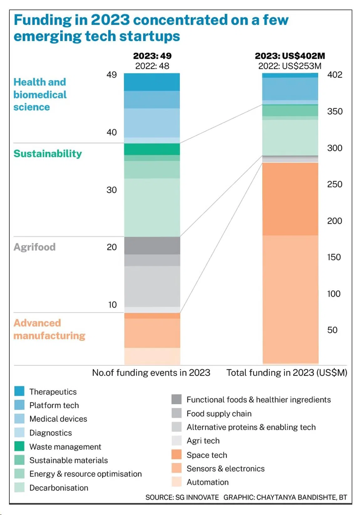 Advanced manufacturing appears to have suffered, with not as many startups being founded in 2023. However, SGInnovate executive director Tong Hsien-Hui noted that founders have reclassified their startups to be in the sustainability sector to garner more investment interest.