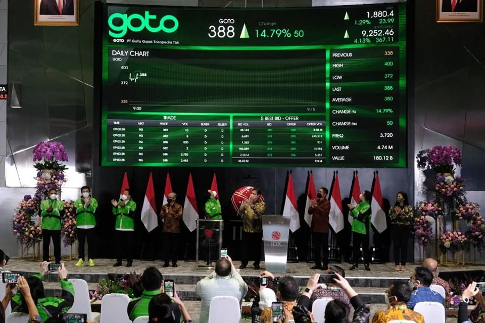 SHARES of Indonesian tech giant GoTo Group soared 14.8 per cent to 388 rupiah upon its debut on the Indonesia Stock Exchange (IDX) on Monday (Apr 11), valuing the company at US$31.6 billion.