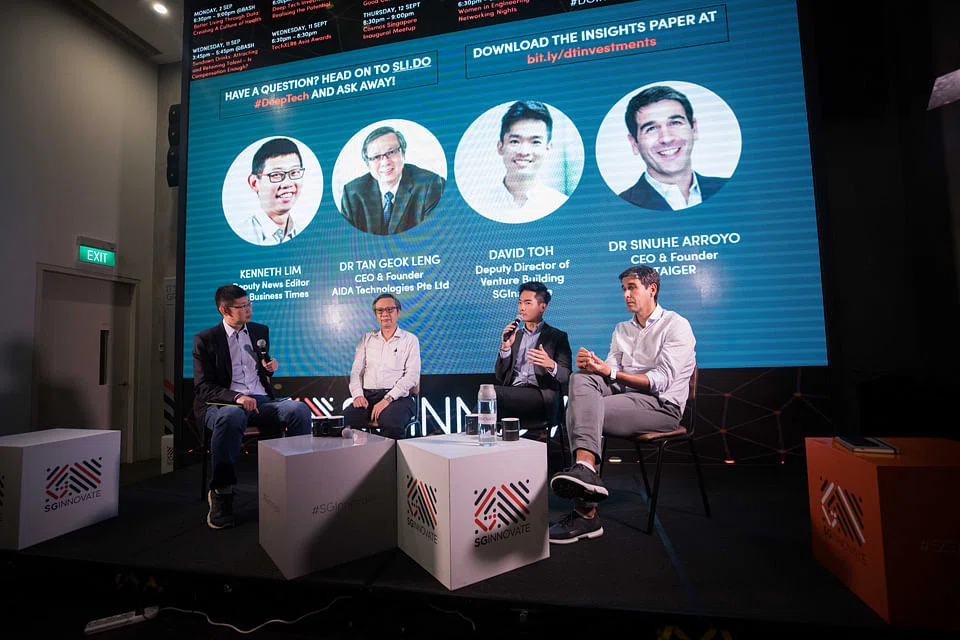 Moderated by The Business Times' deputy news editor Kenneth Lim, the panel featured deep tech entrepreneurs Dr Sinuhe Arroyo, chief executive of AI startup TAIGER; Dr Tan Geok Leng, chief executive of startup AIDA Technologies and David Toh, deputy director of venture building at SGInnovate.