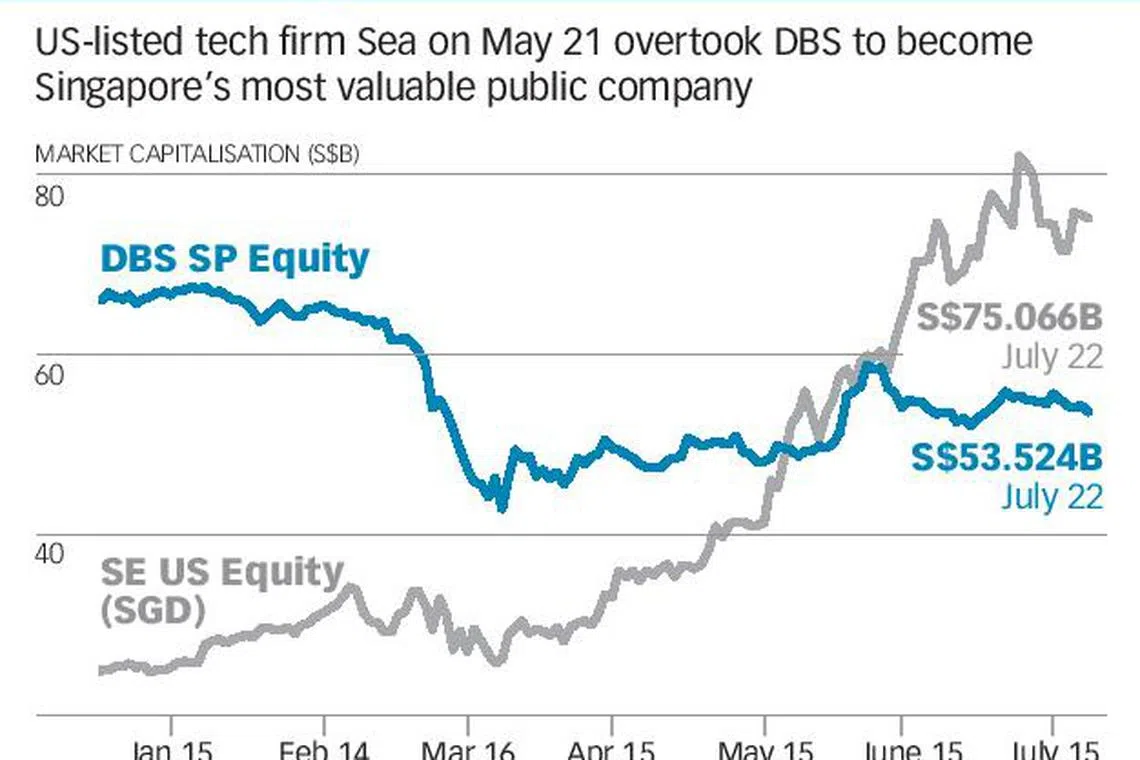 Sea, which is listed on the New York Stock Exchange (NYSE), was valued at S$52.2 billion on May 21, overtaking DBS' market capitalisation of S$49.4 billion. As at July 22, its lead has widened - the group was valued at S$75.1 billion, compared with DBS' S$53.5 billion.