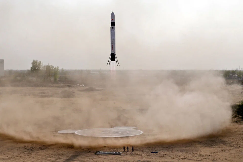 The 1.5-tonne rocket hovered 40 m above the ground before descending back to its concrete launch pad after 30 seconds, to the relief of 26-year-old chief executive Hu Zhenyu and his engineers - one of whom cartwheeled his way to the launch pad in delight.