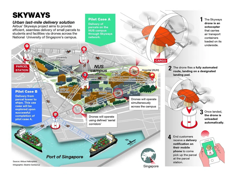 The project, named "Skyways", comes to fruition almost two years after the Civil Aviation Authority of Singapore and Airbus Helicopters, a unit of Airbus, signed up to develop a safe and economically viable aerial unmanned delivery system for parcels in urban environments. The NUS campus is a test bed for the project.