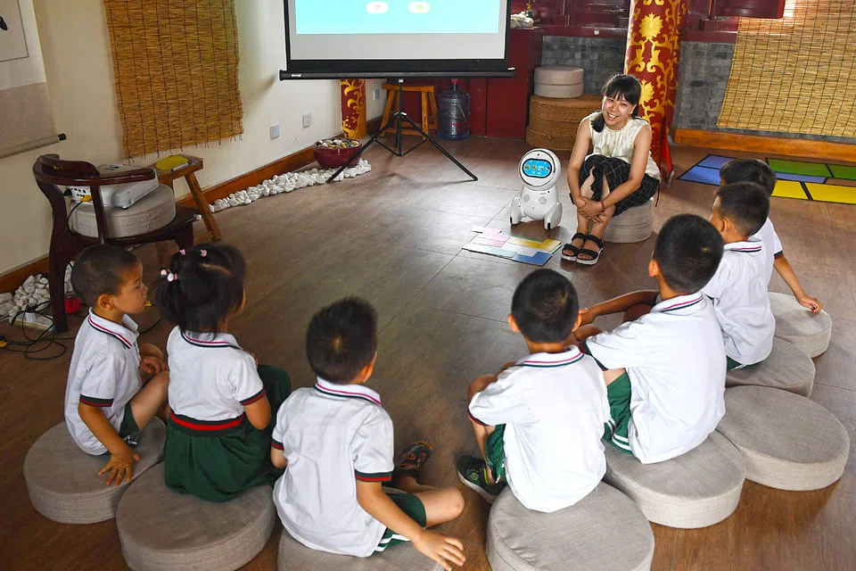 THE CHINESE kindergarten children giggled as they worked to solve puzzles assigned by their new teaching assistant: a roundish, short educator with a screen for a face.