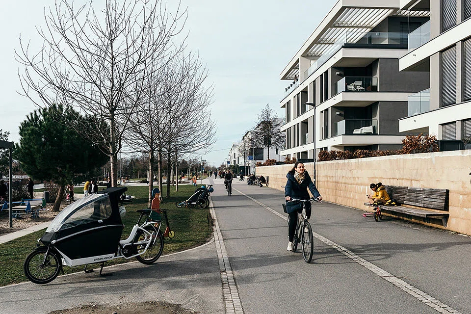 Cars are not banned from the Bahnstadt, but there is almost no traffic. Most streets are dead ends. Apartment buildings are arranged around generous courtyards with playgrounds and connected by walkways. The one street that cuts through the neighbourhood has a speed limit of 30 kmh. Bicycles have the right of way.