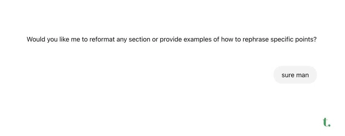 As such, using chatbots such as ChatGPT to create a whole new resume from scratch has its risks. When I instructed ChatGPT to do up an entire resume based on the information from my LinkedIn profile, it simply created a duplicate of what existed online with little value-add.