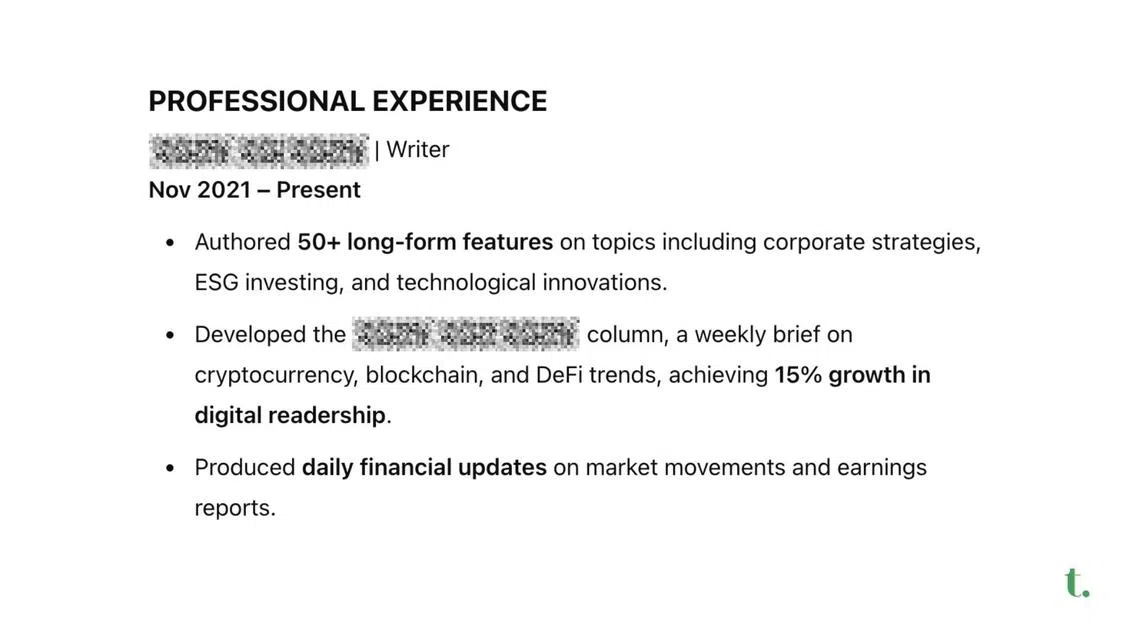 - Reorganise your āExperienceā by emphasising quantified achievements. Specify measurable outcomes like audience growth, revenue contribution, or the number of articles published.