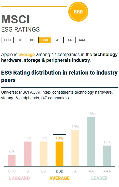MSCI has a tool on its website that shows you a company’s ratings for free. For example, if you pull up Apple, you’ll see that MSCI rates it BBB, or “average”, among companies in its industry.Â