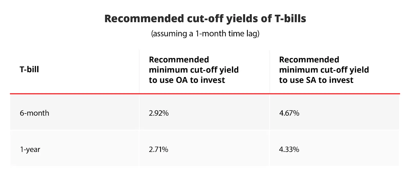 Based on DBSâ calculations, these are the minimum T-bill cut-off yields that will net you a higher return.