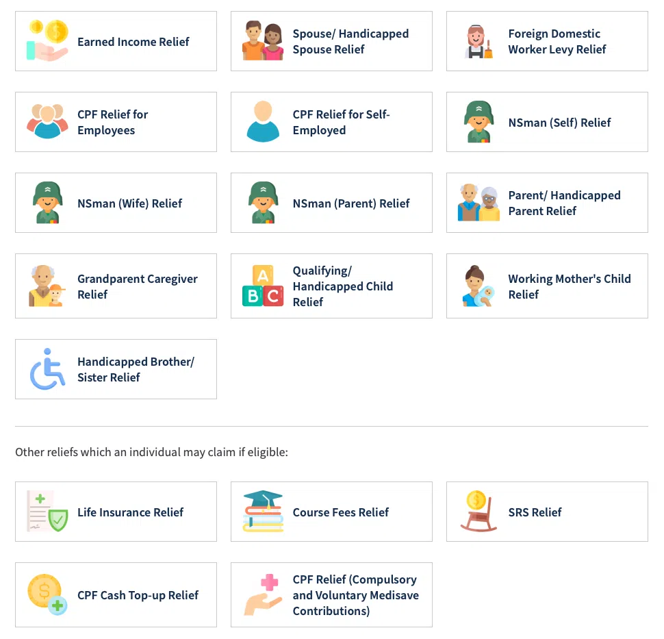 These are the reliefs on the Inland Revenue Authority of Singaporeâs (IRAS) website that tax residents (including non-citizens who are in Singapore for more than 183 days in a year) may be eligible for.Â