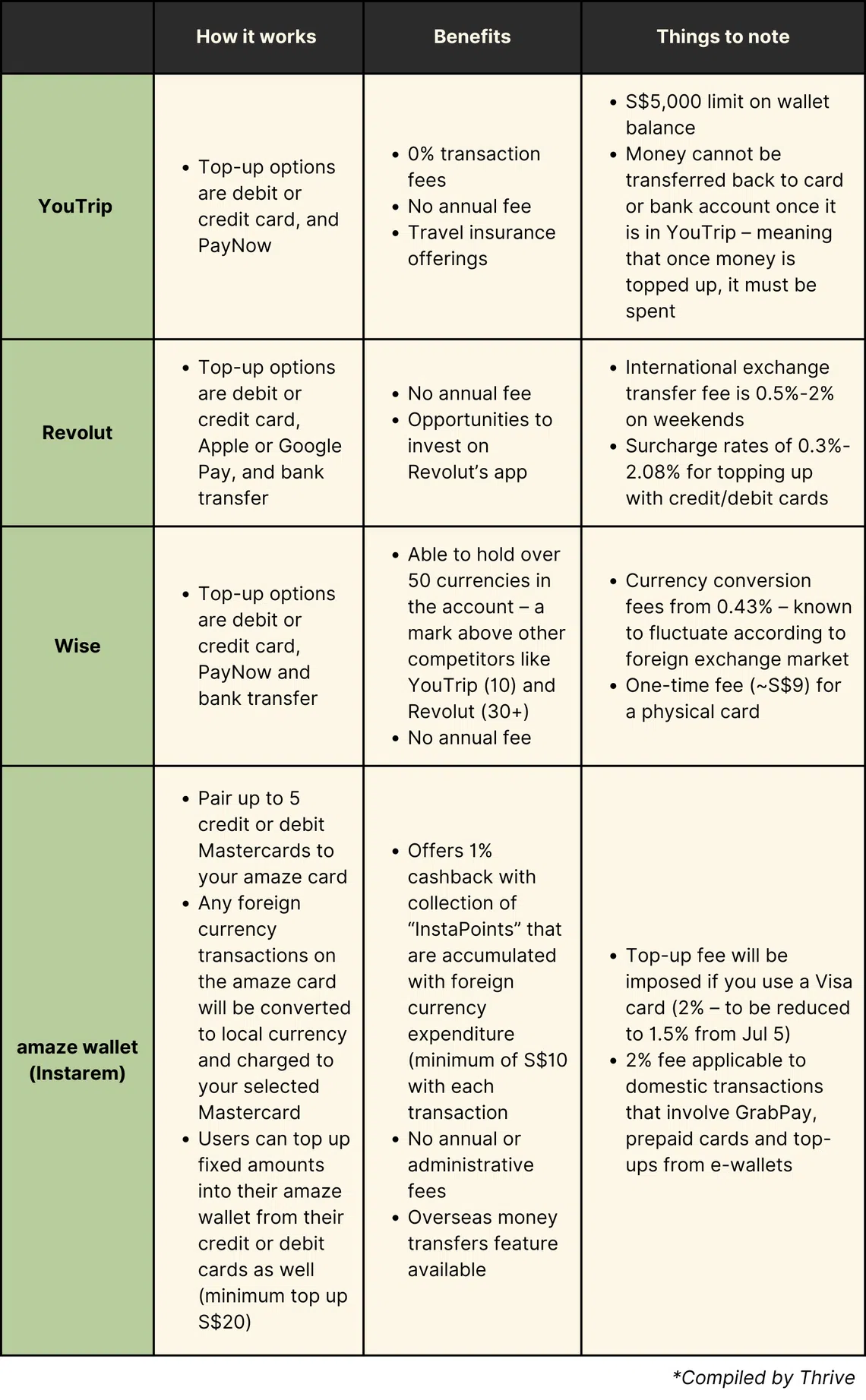 - Fees and charges: Some travel cards may have ATM withdrawal fees, annual fees or currency conversion fees (for certain currencies). For example, Revolutās foreign transaction fee rate can go up to 2 per cent on weekends. However, this continues to stay lower than other card companiesā rates, which tend to go above 3 per cent (inclusive of charges imposed by card associations such as Visa or Mastercard). Wise charges S$1.50 on a userās third withdrawal within a month, and a 1.75 per cent fee on any amount a user withdraws that is above S$350. Do check the fee structure of the card and evaluate whether the benefits outweigh the costs for you.Ā