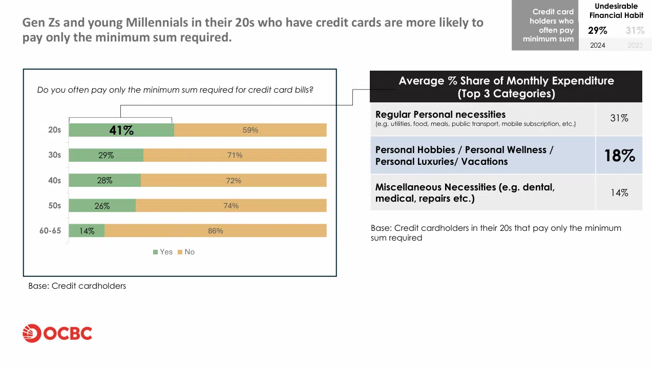 - Some 41 per cent of working adults in their twenties say they often pay only the minimum amount required for their credit card bills.Ā