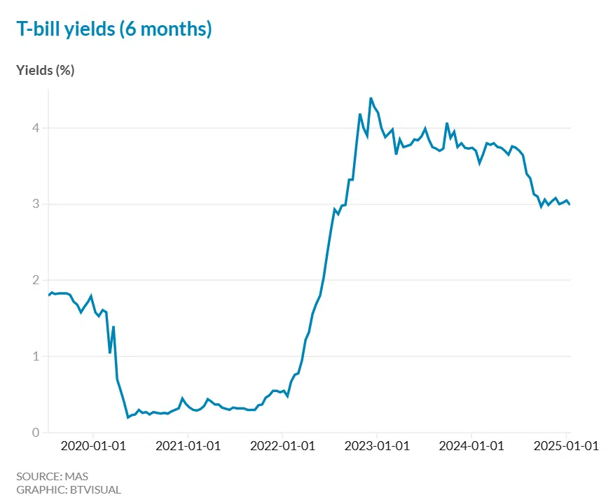 Despite a series of interest rate cuts by the US Federal Reserve, which affects rates in Singapore, T-bill rates are still holding steady at around 3 per cent. With concerns over inflation being sticky, rates are still expected to remain attractive in 2025.